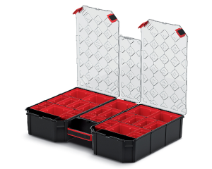 - Funkcjonalne pojemniki wewnątrz, pozwalają w łatwy sposób rozdzielić zawartość i błyskawicznie uporządkujesz warsztat. W razie potrzeby każdy pojemnik możesz wyciągnąć z organizera.
