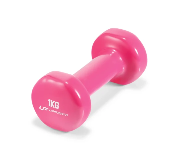 Hantla o wadze 1 kg w kolorze różowym polskiej marki UpForm pokryta warstwą winylu, który zapewnia pewny chwyt. Hantla umożliwia wykonywanie różnorodnych ćwiczeń takich jak przysiady z hantlami (wzmacniające nogi i pośladki), wyciskanie na leżąco, unoszenie ramion (doskonałe na bicepsy i tricepsy) oraz ćwiczenia izolowane, które pozwalają precyzyjnie pracować nad mięśniami.