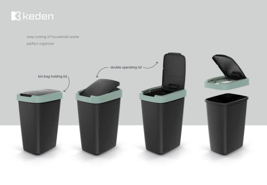 Kosz na śmieci Keden Compacta Q Flap o pojemności 45 litrów to nowoczesne, funkcjonalne rozwiązanie do segregacji odpadów w kuchni, łazience lub biurze. Wyposażony w uchylną klapę, ergonomiczny kołnierz na worek oraz wykonaną z trwałego tworzywa konstrukcję – częściowo z recyklingu. Polska marka, wysoka jakość i wygoda użytkowania.