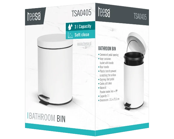 Potrzebny Ci mały kosz na śmieci do łazienki? 3-litrowy model z oferty Teesa będzie idealnym wyborem! Jedną z jego podstawowych zalet oddzielny wyjmowany pojemnik z uchwytem, który umożliwia łatwe opróżnianie. Takie rozwiązanie pozwoli Ci pożegnać się z nieestetycznym workiem na śmieci wystającym z kosza. Kosz na śmieci do łazienki powinien spełniać Twoje oczekiwania nie tylko pod względem użytkowym, ale także estetycznym. Biała, matowa obudowa kosza Teesa została wykonana z żelaza malowanego proszkowo, co w połączeniu z wolnoopadającą pokrywą tworzy stylowe akcesorium, które doskonale wkomponuje się w nowoczesne wnętrza łazienek. Co ważne, nie musisz martwić się, że żelazna obudowa pozostawi zarysowania na podłodze. Kosz na śmieci Teesa posiada podstawę z tworzywa sztucznego, która zapobiegnie rysowaniu powierzchni.