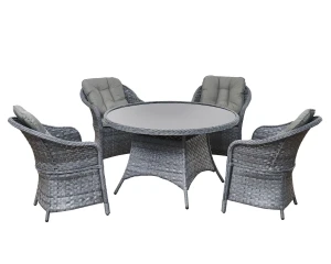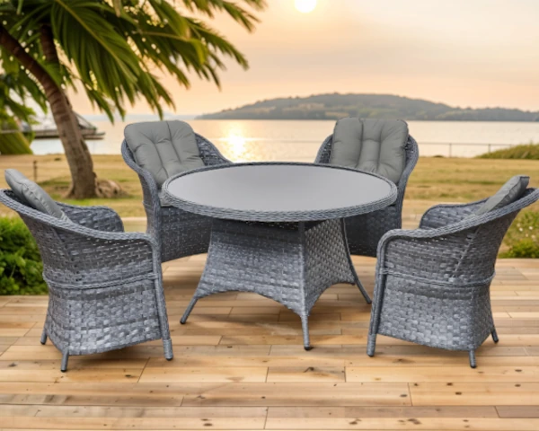 Zestaw mebli do ogrodu marki Bello Giardino sprawi, że wspólne posiłki w ogrodzie będą jeszcze bardziej przyjemne. Wykonany z rattanu syntetycznego, materiału który jest dużo bardziej wytrzymały i praktyczny niż jego naturalny odpowiednik. Siedziska i oparcia wykonane są z pianki odpornej na odkształcenia, a ich pokrowce zrobiono z materiału odpornego na wodę, który nadaje się do prania w niskich temperaturach.