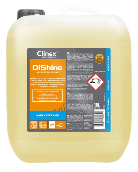 Nabłyszczacz do zmywarek gastronomicznych polskiej marki Clinex doskonale sprawdza się przy płukaniu i nabłyszczaniu naczyń. Preparat zawiera specjalny osuszacz, który przyśpiesza spływanie wody z powierzchni, dzięki czemu eliminuje powstawanie plan i zacieków. Płyn nabłyszczający do zmywarki zapobiega osadzaniu się kamienia w zmywarkach. Nabłyszczacz do zmywarek gastronomicznych Clinex DiShine Premium jest skuteczny także w twardej wodzie.
