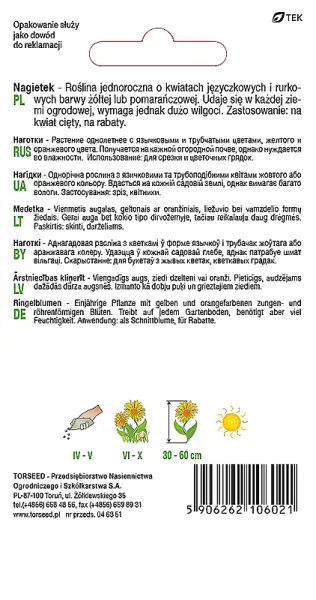 Nagietek to wyselekcjonowane nasiona najwyższej jakości od polskiej firmy Torseed. Idealne dla każdego ogrodnika - amatora, pasjonata czy profesjonalisty. Zasiej w odpowiednim miesiącu zgodnie z kalendarzem siewu.