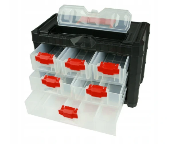 Organizer na małe części Multicase cargo przydatny w pracowni, magazynie czy warsztacie. Szufladki posiadają specjalne zabezpieczenie przed niekontrolowanym wysunięciem lub wypadnięciem z obudowy.