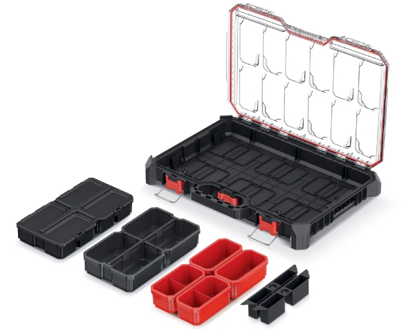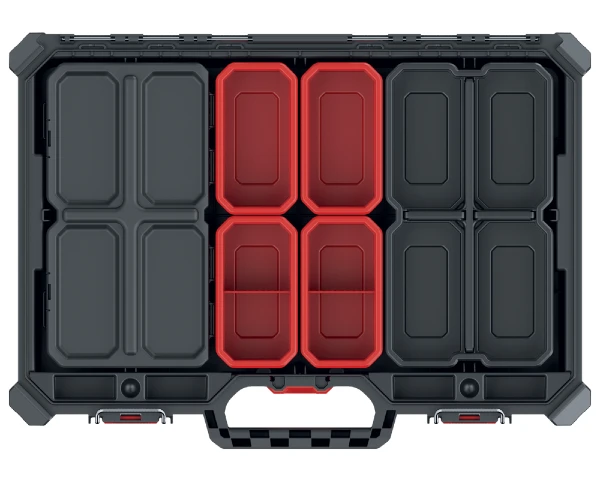 Wysokość zaledwie 7,7 cm pozwoli wsunąć organizer nawet w wąską szczelinę. Profesjonalny organizer jest pyłoszczelny i odporny na zalania. Pokrywa walizki zaprojektowana jest w sposób, który nie pozwala na przesypywanie się drobnych elementów między pojemnikami.