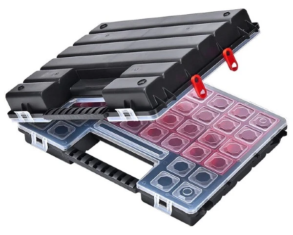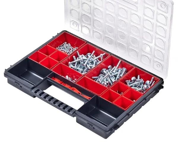 Stałe przegrody dzięki którym wszystkie drobne akcesoria przechowywane w organizerze będą zawsze na właściwym miejscu.