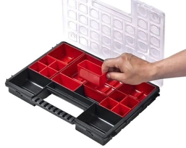Wyjmowane i regulowane przegrody pozwalają na dopasowanie ich wielkości do rozmiarów przechowywanych akcesoriów. Dzięki tej funkcjonalności można bez wysiłku dostosować organizer do indywidualnych potrzeb.