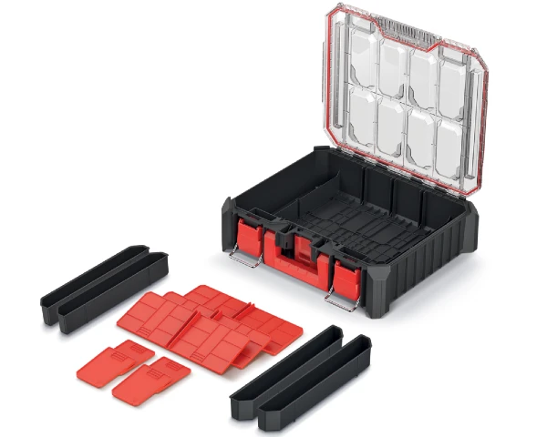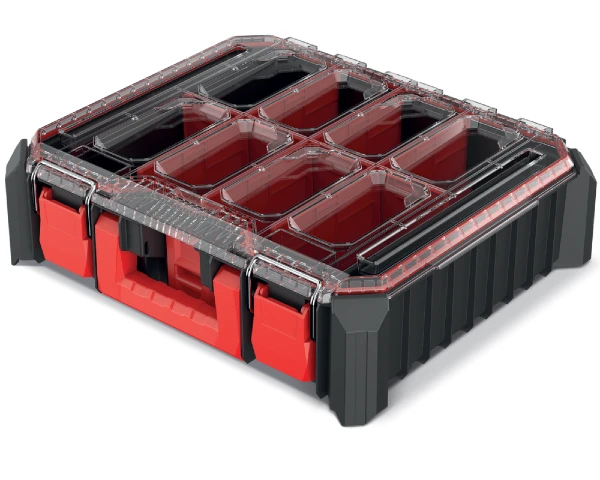 Organizery są pyłoszczelne i odporne na zalanie. Pokrywy walizek zaprojektowane są w sposób, który nie pozwala na przesypywanie się drobnych elementów między komorami.