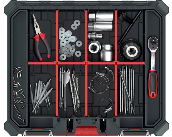 Dzięki praktycznym przegródkom możesz swobodnie segregować swoje narzędzia i akcesoria oraz mieć je zawsze pod ręką. Nie musisz już szukać swoich najważniejszych narzędzi. Teraz zorganizujesz je w sposób, który ułatwi prace i pozwoli zaoszczędzić czas.