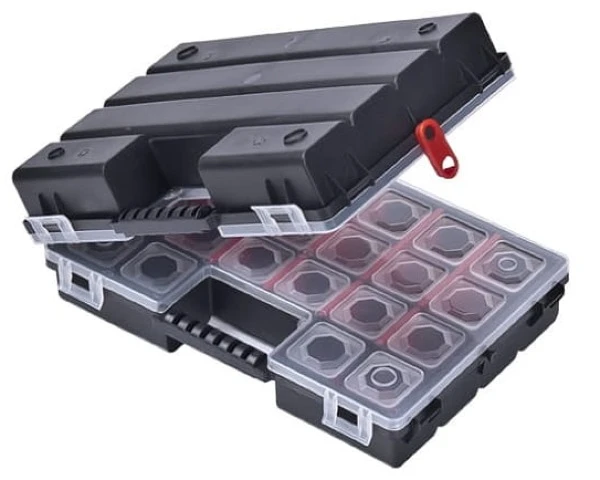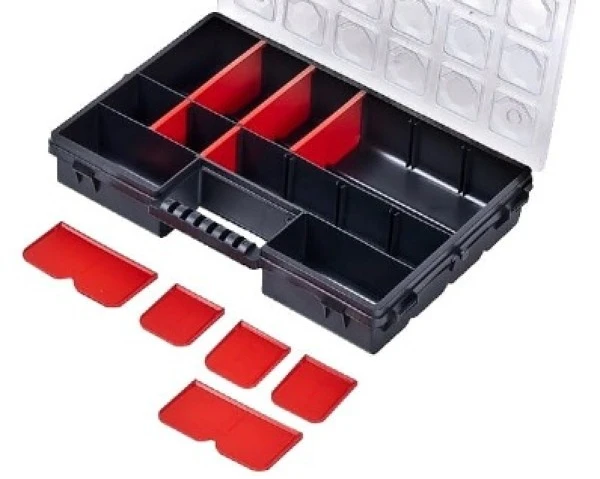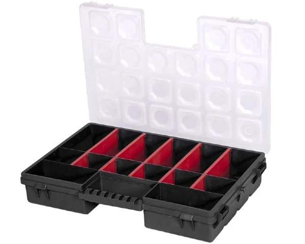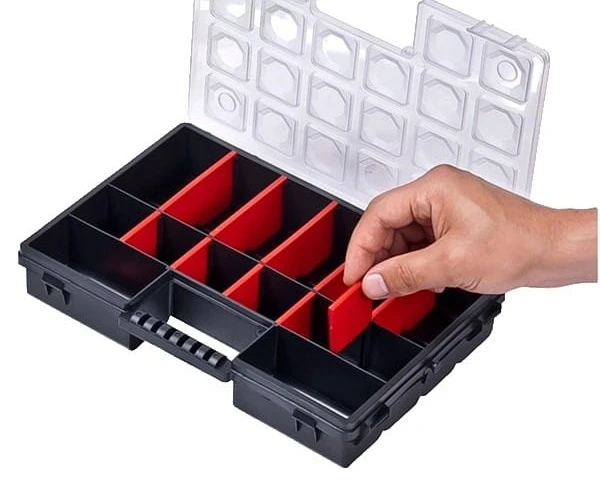 Organizer na różnego rodzaju części jak np. gwoździe, bity czy wkręty. Wyposażony jest w 14 komór i 10 regulowanych przegród, które pomogą Ci utrzymać porządek w warsztacie. Przezroczysta pokrywa ułatwia identyfikację zawartości bez potrzeby każdorazowego otwierania organizera, zwłaszcza gdy posiadasz więcej pojemników tego typu.