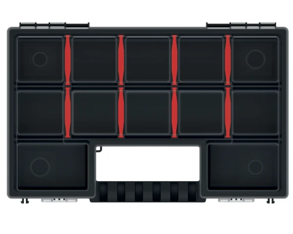 Organizer do domu i warsztatu posiada 8 ruchomych wyjmowanych przegródek do aranżacji przestrzeni wewnętrznej. Ułatwia to przechowywanie i transportowanie zawartości. Wygodny pojemnik na drobne narzędzia ręczne i przedmioty wykonany jest z wytrzymałego tworzywa, które zapewnia długotrwałe użytkowanie.