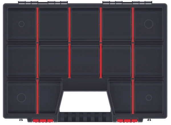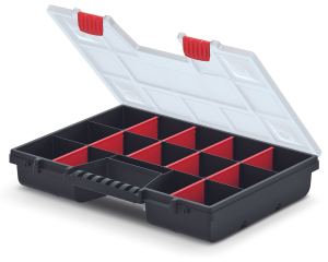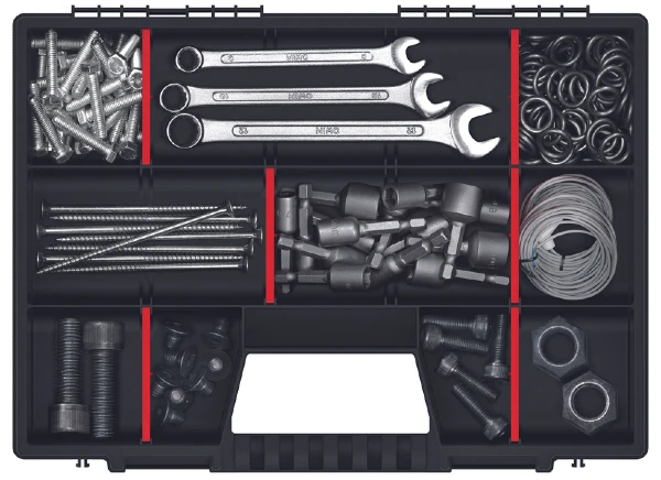 Organizer narzędziowy KNO40307 to alternatywa dla pokrewnego modelu organizera KNO40305S. Różni się od niego głównie organizacją przegród wewnątrz. Są one większe i jest ich nieco mniej. Ten organizer przyda się więc do przechowywania większych drobiazgów - jak duże śruby, wiertła czy gwoździe.