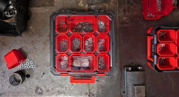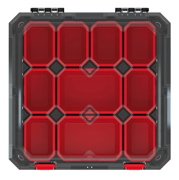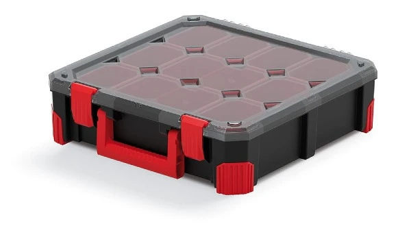 Organizer warsztatowy z funkcjonalnymi ruchomymi przegrodami wewnątrz. Posiada poliwęglanową pokrywę, która jest odporna na uszkodzenia, a także wytrzymałe zapięcia i rączkę z ABS. Krawędzie organizera zostały dodatkowo wzmocnione elastycznym elastomerem.