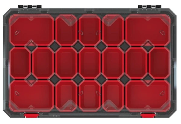 Organizer Titan dedykowany zarówno dla profesjonalistów i majsterkowiczów. Skrzynki przeznaczone są do przechowywania i przenoszenia elementów różnej wielkości. Mogą to być zarówno narzędzia warsztatowe i budowlane, a także gwoździe, wkręty, kołki, nity itp. Seria Titan produkcji Kistenberg dostępna jest w 3 rozmiarach i 2 wariantach wyposażenia. Ten model posiada 15 wyjmowanych kuwet różnej wielkości, które można ustawić wedle własnych preferencji. Pokrywa organizera została wykonana z poliwęglanu, który odporny jest na wszelkie uszkodzenia. Skrzynka posiada również ergonomiczny uchwyt, który ułatwia transport organizera.