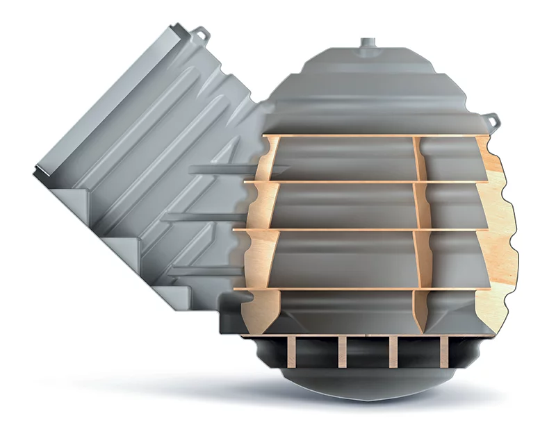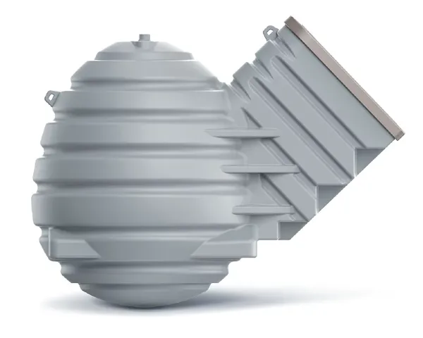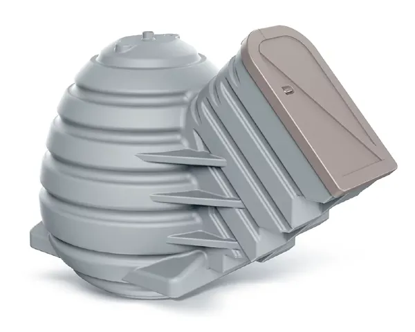 Wykonana z odpornego na wilgoć i warunki atmosferyczne polietylenu, piwniczka OVO nie wymaga dodatkowego kotwienia w gruncie – jest stabilna dzięki wypustom kotwiczącym. Całość konstrukcji zapewnia szczelność, chroniąc wnętrze przed wilgocią, insektami czy gryzoniami. Grawitacyjna wentylacja (komin o średnicy 110 mm) działa bez zasilania, zapewniając ciągłą wymianę powietrza dzięki różnicy temperatur między wnętrzem a otoczeniem.