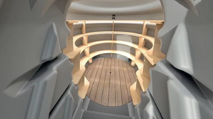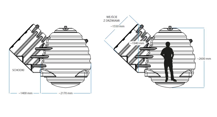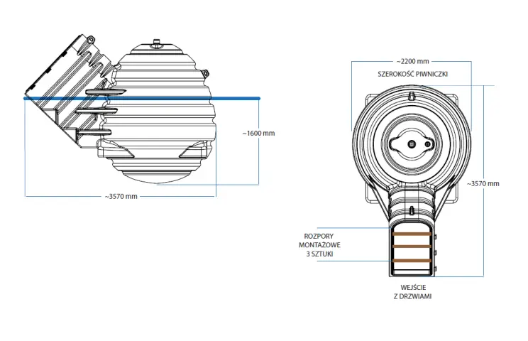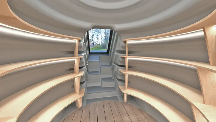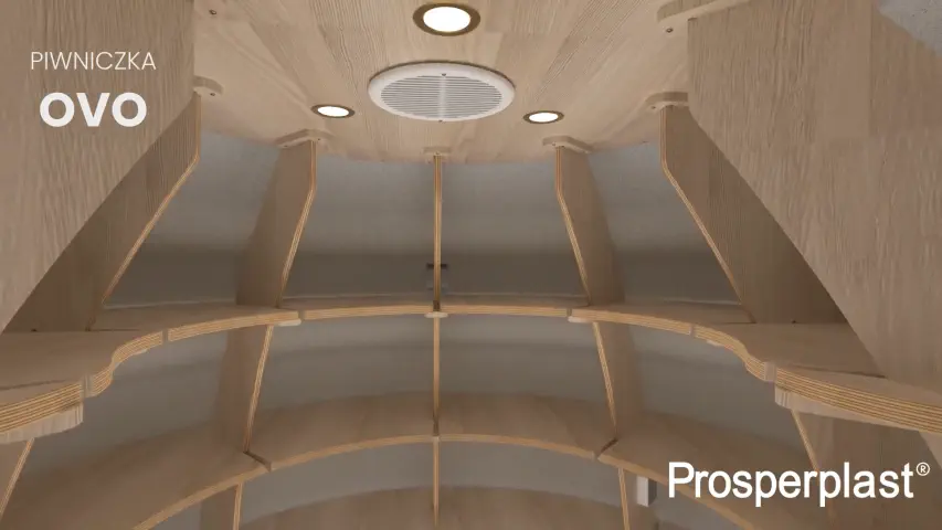 Piwniczka OVO to nie tylko funkcjonalność, ale również nowoczesny design. Drzwi imitujące drewno są izolowane i zamykane na kluczyk, a wnętrze doświetlają trzy światła LED (w oprawach GU10), zasilane z instalacji 230V. Dodatkowe wyposażenie, takie jak barierka schodowa, zwiększa komfort użytkowania i bezpieczeństwo. Całość zaprojektowano z myślą o ergonomii – półki o łącznej powierzchni 6,7 m² pomieszczą spore zapasy, z maksymalnym udźwigiem 150 kg.