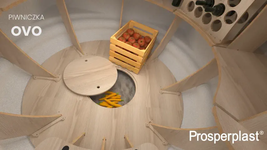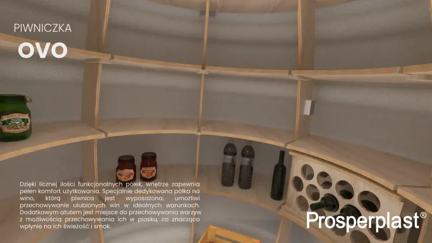 Podziemna konstrukcja piwniczki OVO zapewnia naturalne, stabilne warunki temperaturowe idealne do przechowywania przetworów, świeżych warzyw, owoców, a także win i nalewek. Dzięki temu można znacznie ograniczyć korzystanie z lodówek czy zamrażarek, co przekłada się na realne oszczędności na rachunkach za energię elektryczną. Piwniczka posiada także specjalną półkę do przechowywania win oraz podłogę z otworem rewizyjnym umożliwiającym składowanie warzyw w piasku, co wpływa pozytywnie na ich świeżość i walory smakowe.