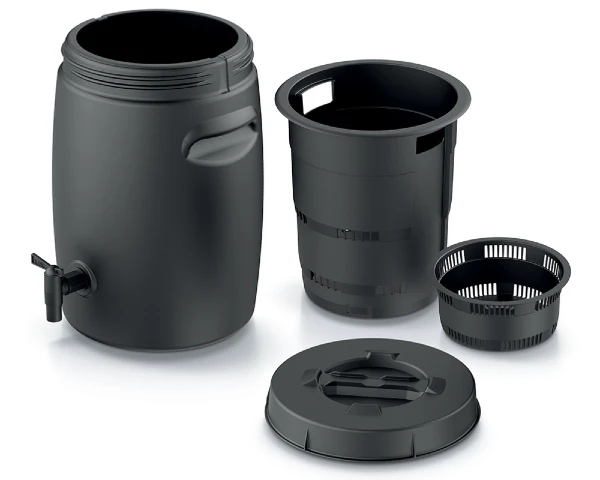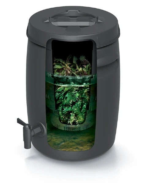 Specjalny pojemnik do wytwarzania naturalnego nawozu płynnego np. z pokrzyw. Beczka z kranikiem oraz wewnętrznymi pojemnikami to kompletny zestaw do samodzielnego wyrobu ekologicznych nawozów.
