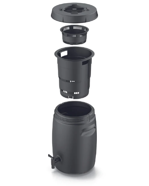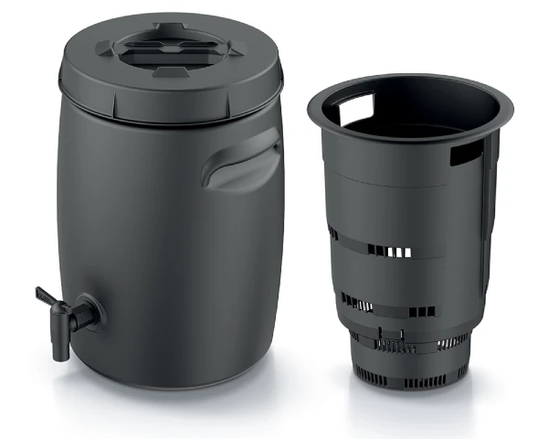 Odkryj nasz wyjątkowy pojemnik do wytwarzania nawozu płynnego - idealne rozwiązanie dla ekologicznych praktyk ogrodniczych. Ten praktyczny pojemnik w kolorze czarnym, został wykonany z wysokiej jakości tworzywa sztucznego, które zapewnia nie tylko trwałość, ale także odporność na różnorodne warunki atmosferyczne. Dzięki temu, możesz mieć pewność, że Twój pojemnik będzie służył przez długi czas, a Twoje rośliny będą cieszyły się najlepszym nawozem. Zestaw pojemnika do wytwarzania nawozu zawiera wszystko, czego potrzebujesz, aby zacząć dbać o swoje rośliny w ekologiczny sposób. Głównym elementem zestawu jest beczka z wygodnym kranikiem, który ułatwia wydobycie płynnego nawozu w wygodny i kontrolowany sposób. Wewnętrzny pojemnik na materiały organiczne jest wyposażony w otwory, które pozwalają na swobodny przepływ wody potrzebnej do procesu wytworzenia nawozu. W zestawie znajduje się też mały pojemnik perforowany oraz praktyczna pokrywa. Pokrywa posiada uchwyty oraz gwint, pozwalający na szczelne zamknięcie beczki.