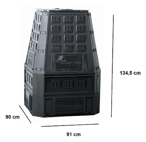 Duży kompostownik ogrodowy w kolorze czarnym o pojemności 850 litrów Evogreen idealnie nadaje się do wytwarzania dużych ilości nawozu organicznego. Kompostownik plastikowy o dużej pojemności i wytrzymałej konstrukcji jest w stanie bez problemu przetrwać wiele sezonów.