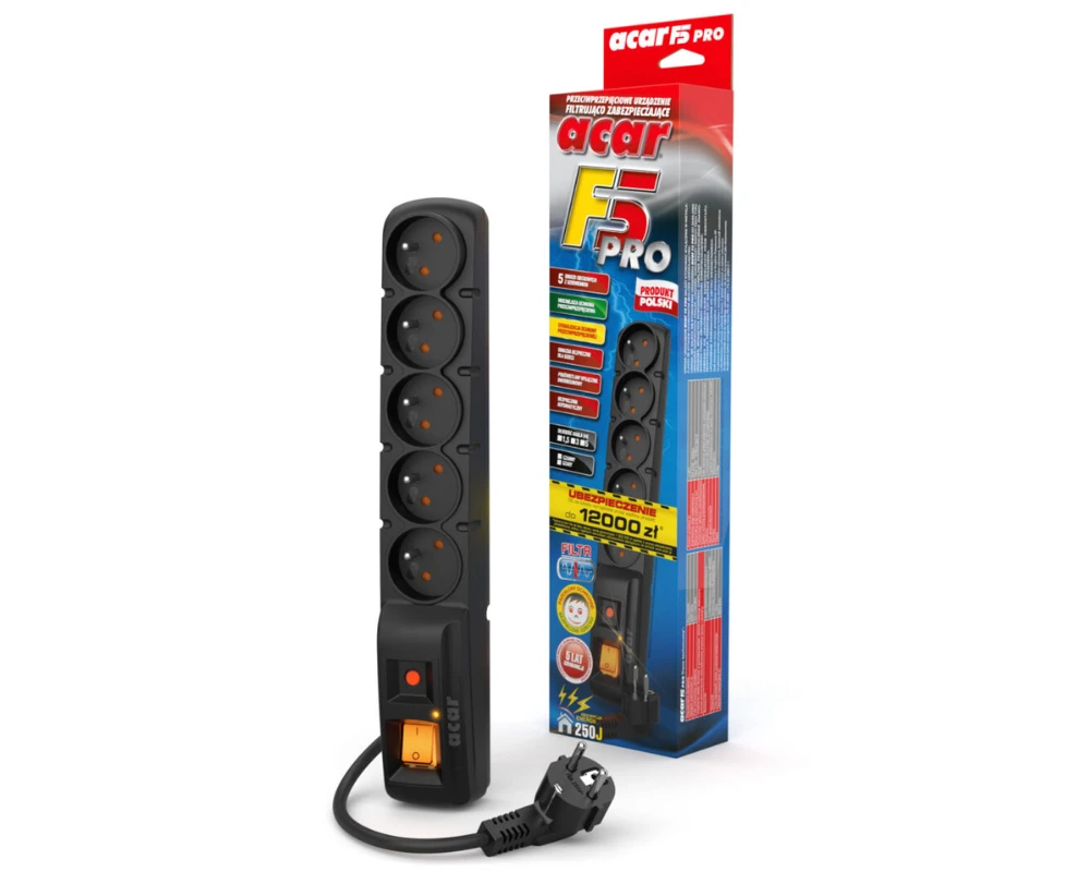 Listwa acar F5 PRO jest najbardziej zaawansowanym urządzeniem z całej rodziny produktów acar F5. Oprócz wzmocnionej ochrony przeciwprzepięciowej przedłużacz posiada filtr tłumiący zakłócenia w sieci elektrycznej oraz sygnalizację poprawnego działania układu protekcji.