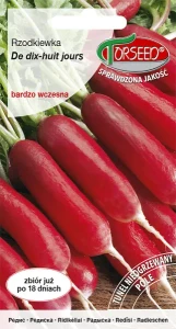 Rzodkiewka De dix-huit jours to wyjątkowo wczesna odmiana, której zgrubienia osiągają dojrzałość już po 18 dniach od siewu. Tworzy charakterystyczne, podłużne korzenie w atrakcyjnym czerwono-białym ubarwieniu. Doskonale sprawdza się w uprawie wiosennej w gruncie, tunelach foliowych, a także jako jesienny poplon. Miąższ jest delikatny, soczysty i pozbawiony ostrości, dzięki czemu odmiana ta szczególnie polecana jest do bezpośredniego spożycia – w sałatkach, na kanapkach lub jako zdrowa przekąska. Szybkość wzrostu oraz walory smakowe czynią ją jedną z chętniej wybieranych odmian do amatorskiej i profesjonalnej uprawy.