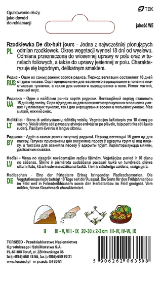 Rzodkiewka czerwono-biała podłużna De dix - huit jours to wyselekcjonowane nasiona najwyższej jakości od polskiej firmy Torseed. Idealne dla każdego ogrodnika - amatora, pasjonata czy profesjonalisty. Zasiej w odpowiednim miesiącu zgodnie z kalendarzem siewu.