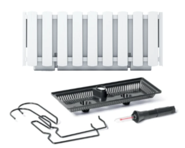Doniczka na balustradę Fencycase z serii Boardee na pierwszy rzut oka wygląda jak skrzynka balkonowa z drewnianych listewek. Swoim kształtem i kolorystyką przypomina ręcznie wykonaną skrzynkę na kwiaty. Rustykalny charakter doniczki balkonowej wprowadza wyjątkową, ciepłą atmosferą. Antracytowy odcień pięknie podkreśla zieleń liści i kolory kwiatów. Podłużna skrzynka balkonowa ma prostokątny kształt i wiernie odzwierciedla wyroby z drewna. Dzięki temu nawiązuje do wiejskiego, spokojnego stylu. Jest to zestaw 3w1: do doniczki dołączone są metalowe haki do zawieszenia na balkonie, płocie lub ogrodzeniu. W komplecie znajduje się również system nawadniania dopasowany do skrzynki balkonowej, dzięki któremu nie trzeba martwić się o przelanie roślin. Dodatkowo, jeśli mieszkasz na piętrze w bloku woda nie kapie na dół z doniczki podczas podlewania i nie przeszkadza sąsiadom.
