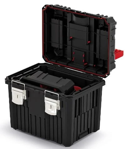 Mobilna skrzynka narzędziowa z zapięciami ze stali ocynkowanej. Pokrywa ze specjalną uszczelką, która chroni zawartość skrzynki na narzędzia przed wodą i pyłami. Mocne, stalowe zapięcia eliminują ryzyko przypadkowego otwarcia.