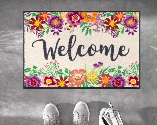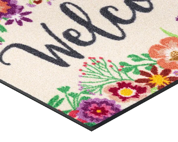Wycieraczka pod drzwi o wymiarach 85 x 60 cm z motywem kwiatów. Trwałe włókna poliamidowe skutecznie zatrzymują zabrudzenia i wilgoć, nie tracą koloru i łatwo usunąć z nich zabrudzenia. Spód maty wykonany jest z gumy nitrylowej. Jest ona elastyczna, nie zawiera szkodliwego PVC, nie łamie się, nie kruszy i nie faluje, przez co można ją prać w pralce w temperaturze do 60 °C.