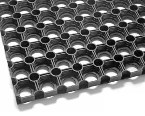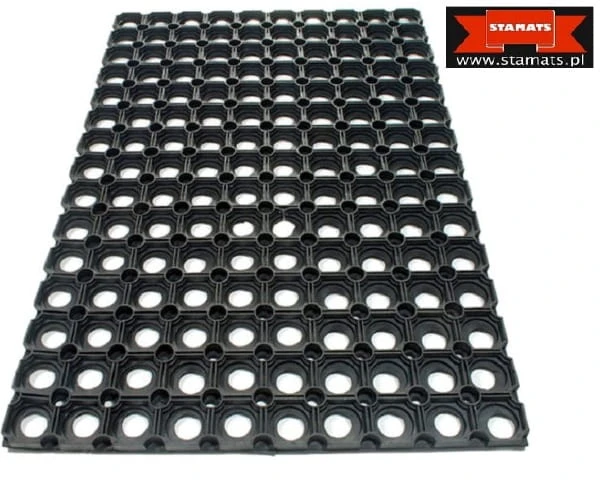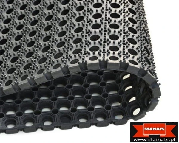 Wycieraczka ażurowa, która doskonale sprawdzi się w miejscach o mniejszym natężeniu ruchu. Wykonana została z wysokiej jakości trudno ścieralnej gumy, która dodatkowo jest odporna na warunki atmosferyczne. Gumimata posiada w dolnej części specjalne wypustki, które zapewniają przyczepność do podłoża oraz poprawiają odprowadzanie wody spod maty. Dzięki temu rozwiązaniu wycieraczka może być stosowana zarówno wewnątrz, jak i na zewnątrz budynków.