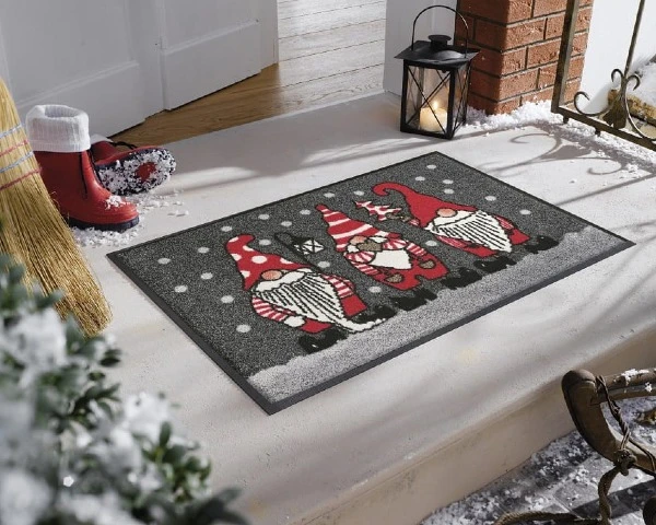 Wycieraczka świąteczna tekstylna z motywem zimowych krasnali. Idealna, aby wprowadzić wszystkich w świąteczny nastrój już od progu. Zatrzymuje zimowe zabrudzenia i pozostaje stabilna dzięki antypoślizgowemu spodowi.