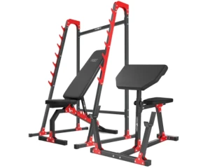 Zestaw do ćwiczeń na siłowni składający się z ławki dwustronnej, stojaków wielopoziomowych oraz modlitewnika wyprodukowany przez polską firmę Marbo Sport.