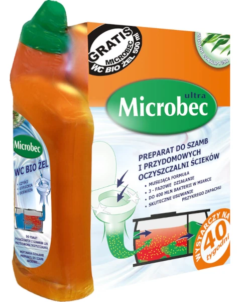 Żel do czyszczenia sanitariatów polskiej marki Microbec przeznaczony jest do instalacji, w których stosowane są preparaty służące do biodegradacji zawartości szamba, a także są połączone z przydomową oczyszczalnią ścieków. Specjalna formuła żelu do czyszczenia toalet została wzbogacona o bakterie i enzymy, co gwarantuje skuteczne czyszczenie i nie niszczy naturalnej flory bakteryjnej zbiorników. Co ważne zawarte w preparacie składniki pomagają stworzyć optymalne warunki do intensywnego namnażania i rozwoju pożytecznych bakterii w szambach i oczyszczalniach.
