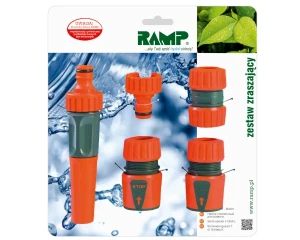 Zraszacz prosty wraz z przyłączkami tworzy zestaw zraszający. Elementy zestawu to: końcówka zraszająca prosta, przyłącze na kran z gwintem wewnętrznym 1/2 cala, szybkozłączka na wąż 1/2 cala, szybkozłączka z systemem Aqua STOP oraz łącznik do węża 1/2 cala.