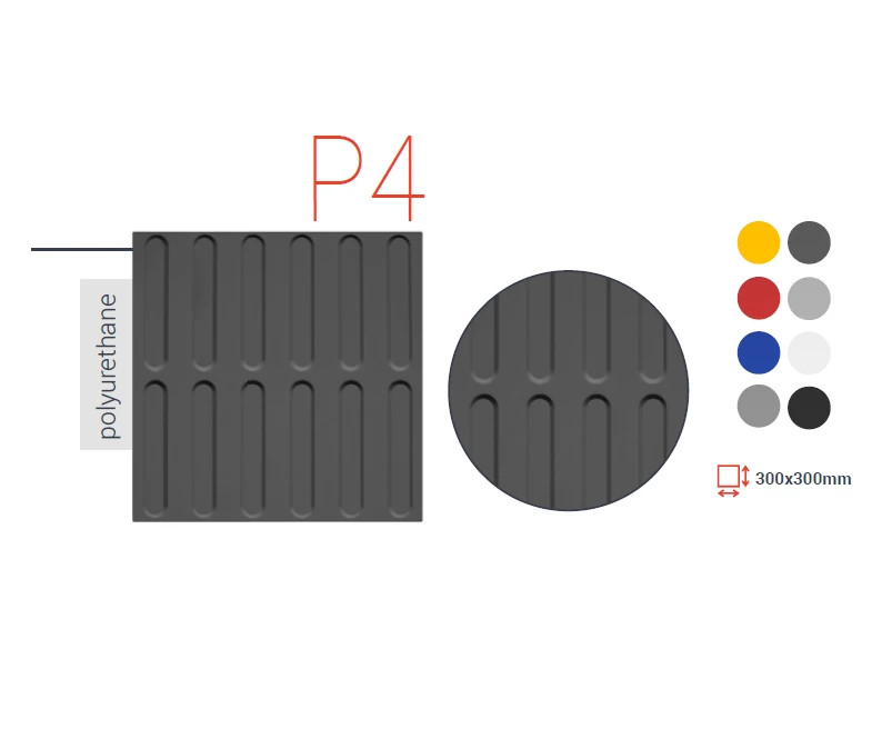 Dotykowe, podłogowe płytki prowadzące P4 wykonane zostały z wytrzymałego poliuretanu odpornego na promieniowanie UV. Posiadają bardzo duży zakres twardości z równoczesnym zachowaniem dużej elastyczności.
