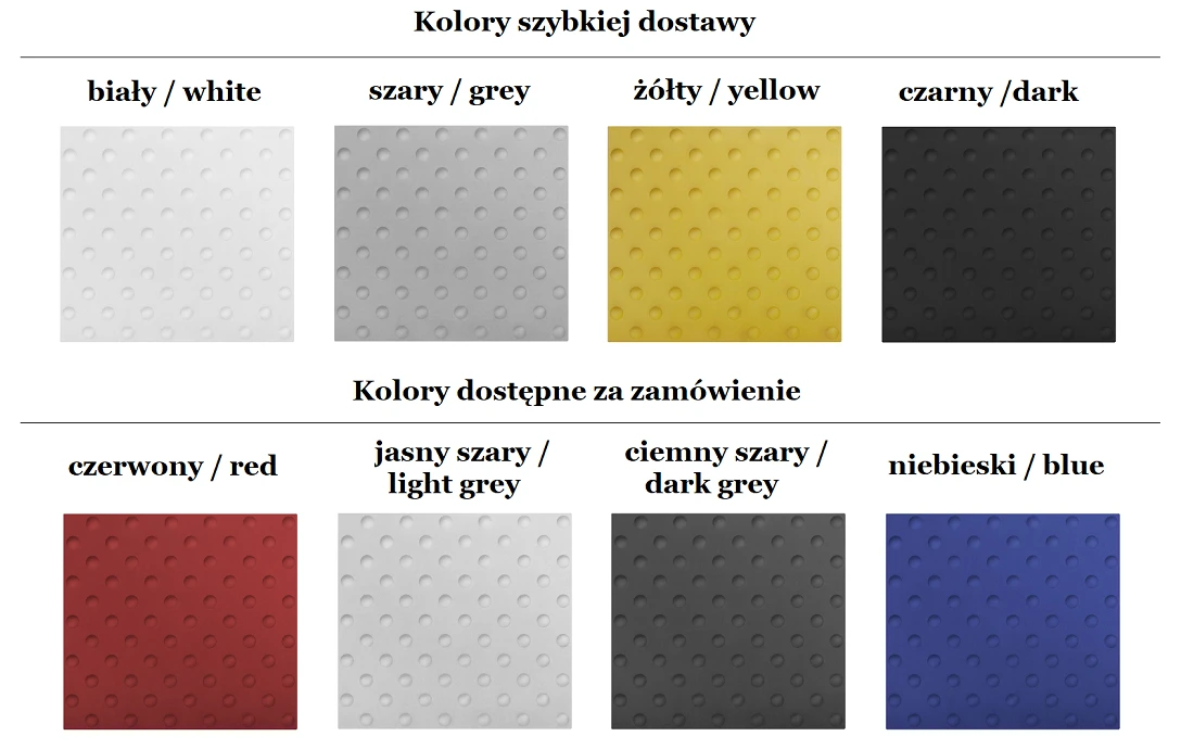 Tabliczki dostępne są w wielu kolorach (zdjęcie poniżej), które pozwalają wybrać najbardziej odpowiednią płytkę dla Twojej instalacji. Wzory tablic ostrzegawczych spełniają wymagania dotyczące właściwości antypoślizgowych.