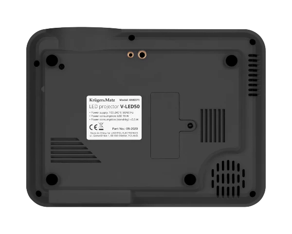 Na spodzie projektora Kruger&Matz V-LED50 znajdziesz dwa gwinty, które umożliwiają montaż projektora do tripoda lub uchwytu.