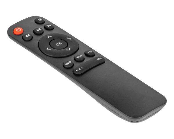 Do zestawu został dołączony pilot, dzięki któremu możesz np. wybierać źródło odtwarzania czy regulować głośność bez podnoszenia się z kanapy.