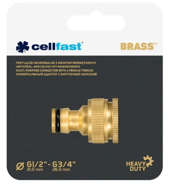 Przyłącze z mosiądzu z gwintem wewnętrznym BRASS do kranu z gwintem zewnętrznym 1/2"(21 mm) lub 3/4"(26,5 mm). Stosowane jest w systemach podlewania i nawadniania. Przyłącze można też wkręcić w ujście z gwintem zewnętrznym (1/2" lub 3/4"), końcówkę węża należy wyposażyć w szybkozłącze. Dzięki zatrzaskom szybkozłącza precyzyjne połączenie uzyskiwane jest tylko za pomocą wciśnięcia szybkozłącza na przyłącze kranowe. W celu odłączenia węża od kranu wystarczy pociągnąć za szybkozłącze z wężem. Konstrukcja umożliwia użycie klucza w celu łatwiejszego montażu. Seria BRASS to produkty premium z gwarancją najwyższej jakości. Wszystkie produkty systemu wodnego BRASS są wykonane z wytrzymałego mosiądzu dzięki czemu są odporne na zużycie, są też bardzo wytrzymałe i skuteczne oraz wykazują odporność na korozję. Jeśli szukasz rozwiązań, które będą Ci służyć latami koniecznie sprawdź produkty z linii BRASS.
