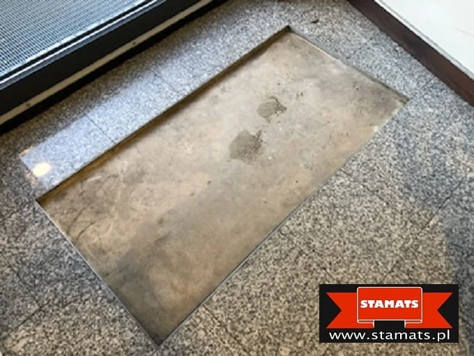 Jeśli zachodzi potrzeba to skorygować wysokość wpustu za pomocą wylewki np. samopoziomującej lub cementowej, tak aby górna krawędź ramki licowała się z krawędzią posadzki. Przytwierdzić ramkę kołkami lub klejem montażowym do wnęki i w ten sposób unikniemy zgrzytania wycieraczki w użytkowaniu.