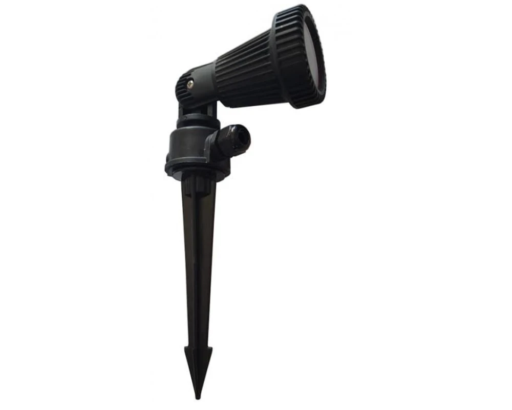 wbijany w ziemię, idealny do podświetlania punktowego w ogrodzie. Reflektor zewnętrzny zasilany z instalacji elektrycznej.
