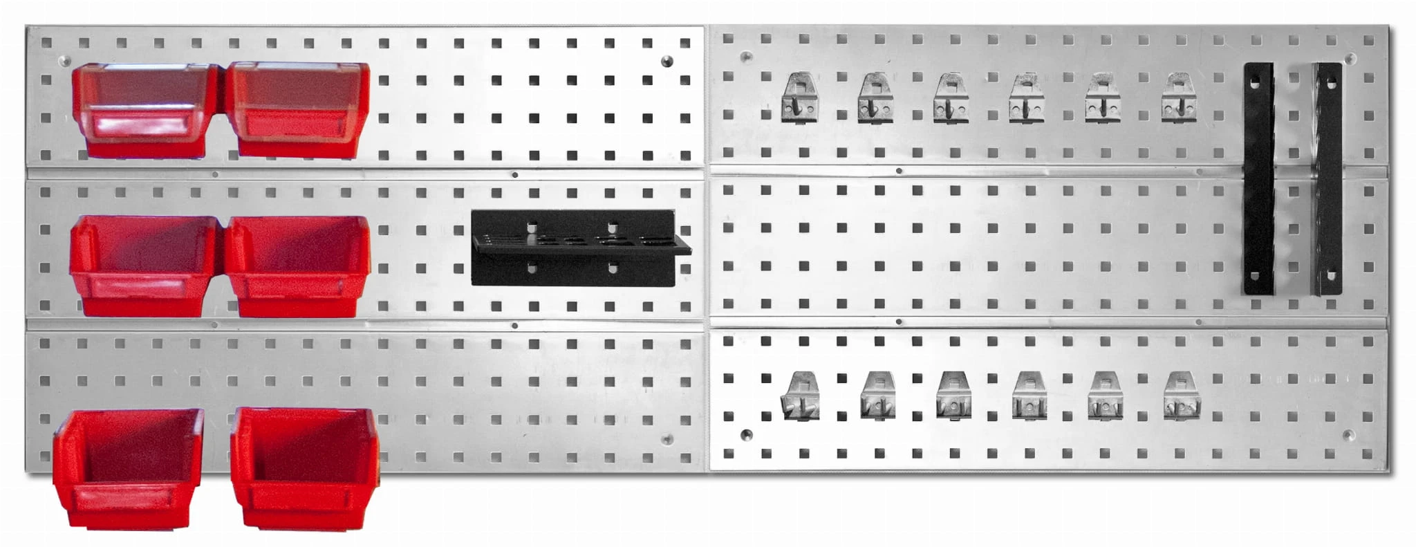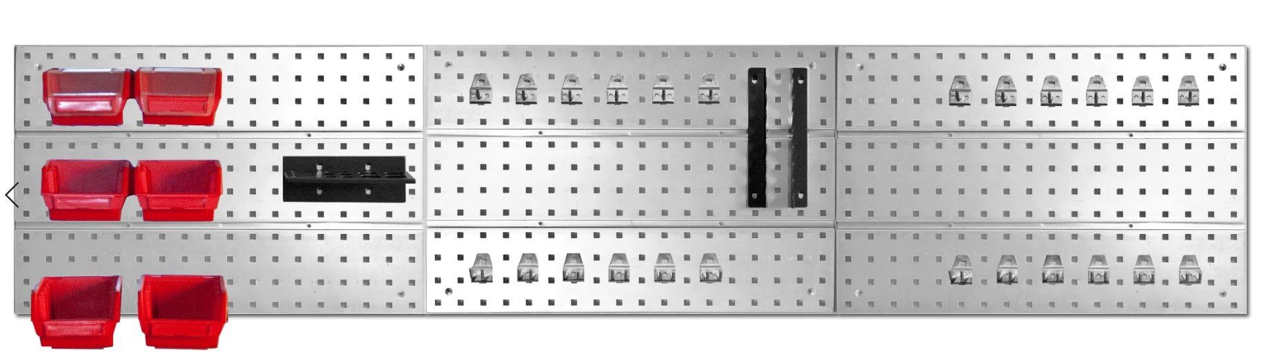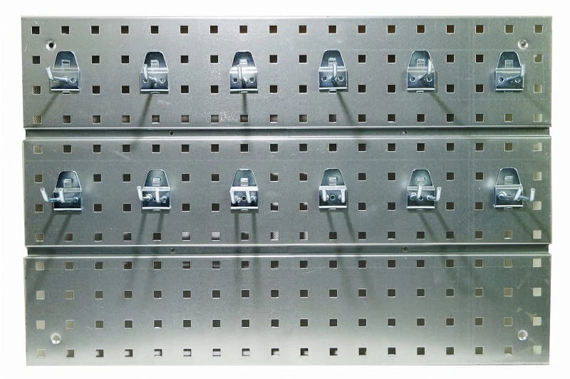 Wykonana z metalu wytrzymała i solidna tablica do zawieszenia na ścianie warsztatu. Umożliwia zamocowanie w niej pojemników magazynowych, akcesoriów i uchwytów, a nawet narzędzi czy innych potrzebnych w magazynie lub warsztacie rzeczy.