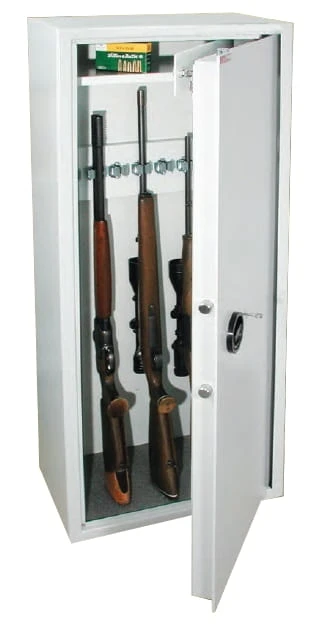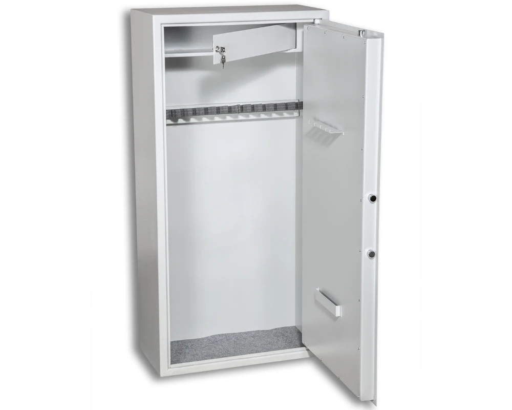 Bezpieczna szafa pancerna do przechowywania broni długiej oraz amunicji. Obudowa prezentowanego sejfu wykonana została z pojedynczego płaszcza blachy stalowej (grubość 3 mm). Drzwi szafy dwuścienne wodzone na zawiasach wewnętrznych, które są chronione specjalną konstrukcją uniemożliwiającą wycięcie. Po zamknięciu drzwi ryglowane są z trzech stron bolcami o średnicy 25 mm. Budowa szafy umożliwia przymocowanie jej do podłoża i/lub ściany.