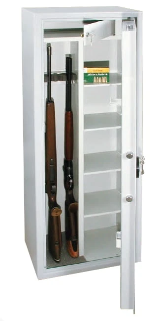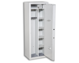 Certyfikowany jednoskrzydłowy sejf na broń. Służy do wygodnego przechowywania do 5 sztuk broni długiej, gładkolufowej, myśliwskiej, sportowej itp. W standardzie wyposażony został w wygodne półki oraz skrytkę wewnętrzną na amunicję.
