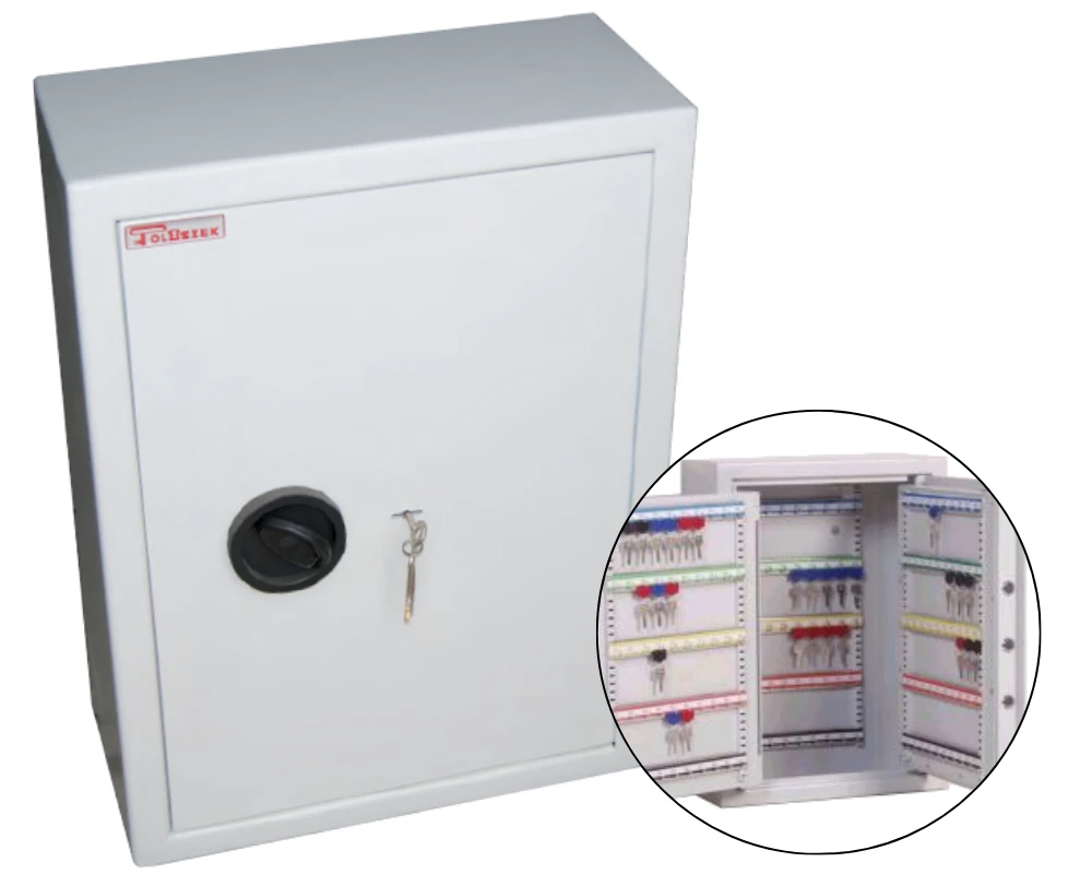 Bezpieczny sejf w którym przechowywać możesz do 200 pęków kluczy. Wszystkie haki są ponumerowane, co znacząco ułatwi znalezienie odpowiedniego klucza - wystarczy prowadzić ewidencję zawieszonych pęków. Obudowa sejfu została wykonana z pojedynczego płaszcza blachy stalowej o grubości 3 mm. Drzwi dwuścienne o łącznej grubości 50 mm. Po zamknięciu drzwi ryglowane są 3 bolcami o średnicy 25 mm. Budowa sejfu umożliwia przymocowanie go do ściany.