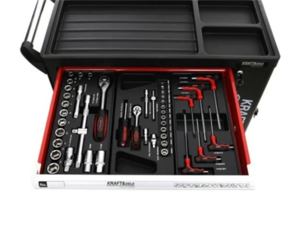 Szafka narzędziowa to niezastąpiony produkt w każdym warsztacie samochodowym oraz garażu. Szafka jest w wyposażona w komplet narzędzi, składający się aż z 263 elementów. Szafka na kółkach na narzędzia została wyposażona w gumowe odbojniki, aby nie uszkodzić karoserii samochodu podczas przypadkowego obicia. Każda szuflada posiada zabezpieczenie przed przypadkowym otwarciem, a także jest zamykana na kluczyk (w zestawie dwa klucze). Każda z szuflad została osadzona na prowadnicach łożyskowanych, przez co ich otwieranie jest płynne, ciche oraz trwałe.