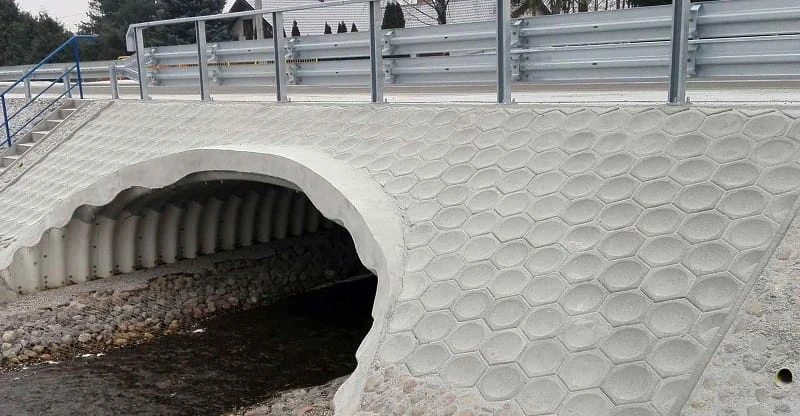 Przykład użycia kostki wklęsłej trylinki o grubości 15 cm jako wzmocnienie mostu: