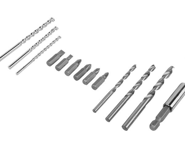 Wraz z wiertarko-wkrętarką w zestawie znalazło się 13 wierteł, aby bezproblemowo dobrać wielkość oraz typ odpowiedni do obrabianego materiału.