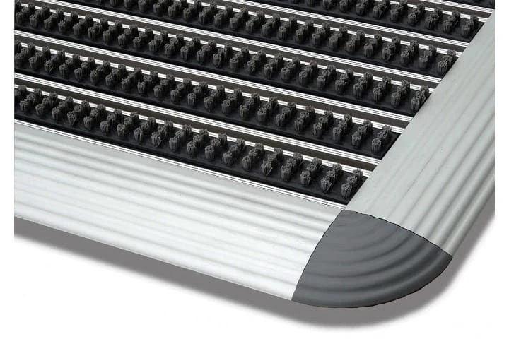 Elementami czyszczącymi są wkłady szczotkowe w aluminiowych profilach nośnych. Spód wycieraczki zabezpiecza posadzkę przed porysowaniem.